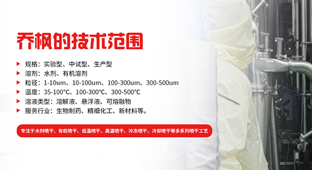 上海喬楓實業有限公司,成立于2012年,是從事噴霧干燥設備的研發設計、生產、銷售(小型噴霧干燥機實驗型噴霧干燥機,35℃低溫噴霧干燥機,有機溶劑噴霧干燥機,低溫閉式循環噴霧干燥機超細粉末噴霧干燥機、噴霧冷凍干燥機、真空噴霧干燥機氣流噴霧干燥機,噴霧造粒干燥機,離心噴霧干燥機,沸騰制粒機等)和售后于一體的綜合性公司,本公司現成為一家致力于為生物制藥、精細化工、新能源、陶瓷造粒及食品工程等領域提供全套解決方案的整線交鑰匙工程企業。